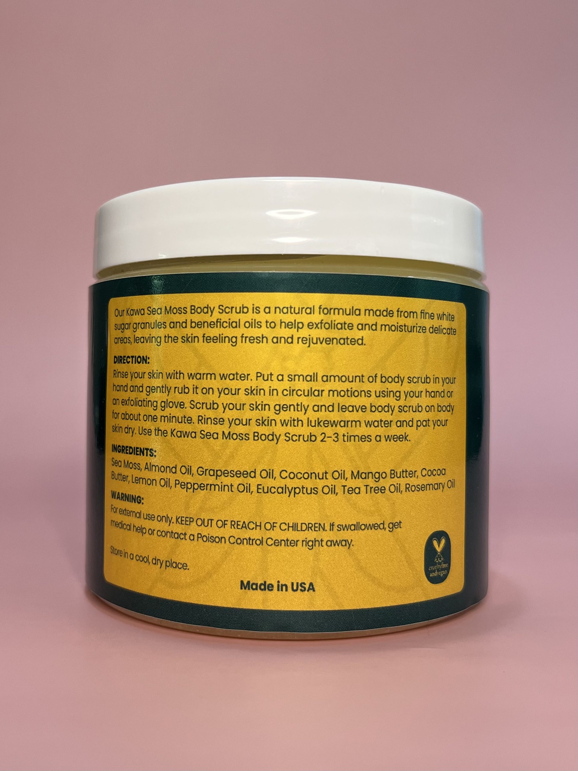 Our Kawa Sea Moss Body Scrub is a natural formula made from fine white sugar granules and beneficial oils to help exfoliate and moisturize delicate areas, leaving the skin feeling fresh and rejuvenated. We chose to name our sea moss body scrub after Kawa (ⲕⲁⲱⲁ) which is an ancient Egyptian colony located in modern day Sudan.