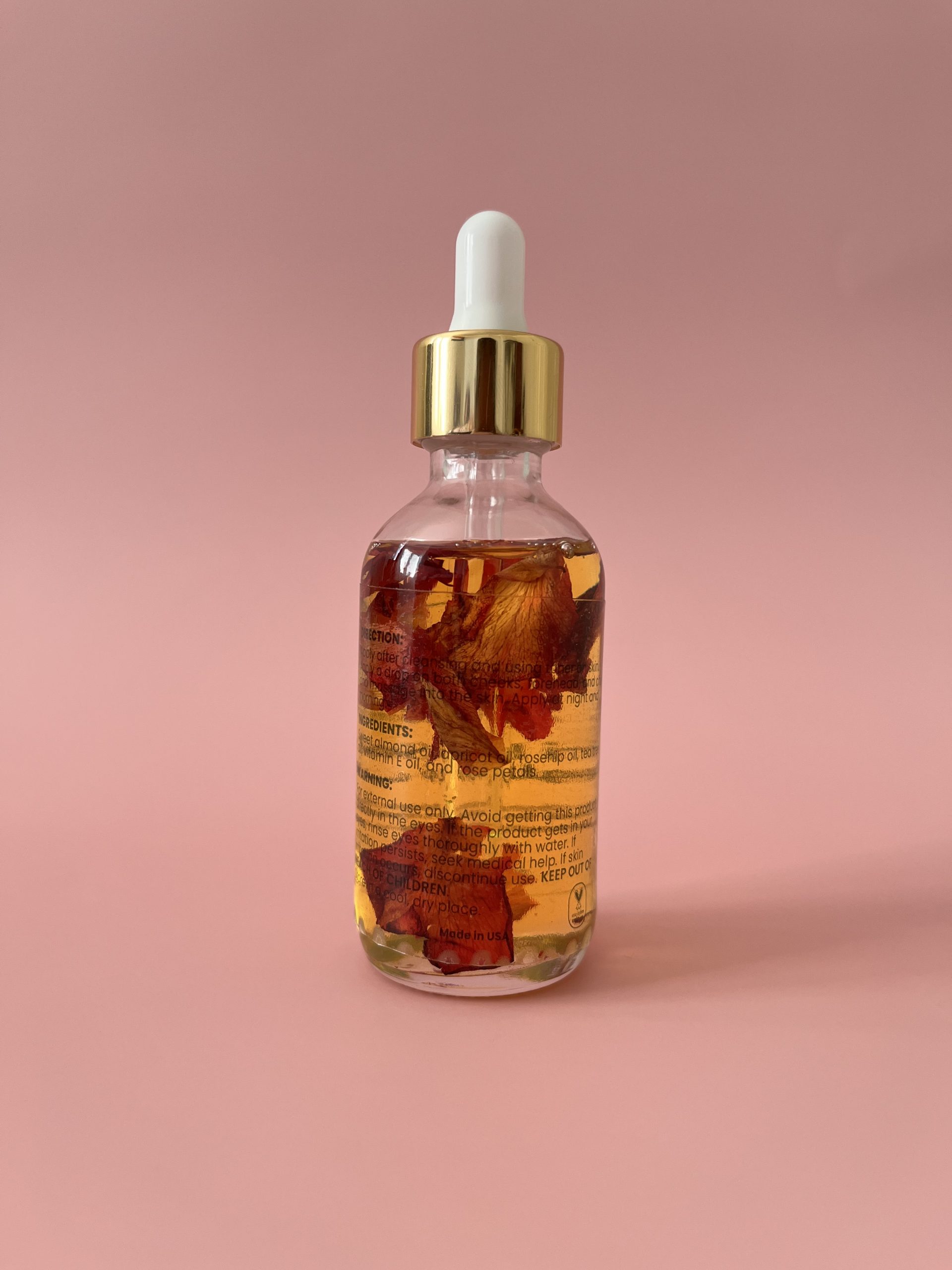 Ingredients: sweet almond oil, apricot oil, rosehip oil, tea tree oil, vitamin E oil, rose petals.